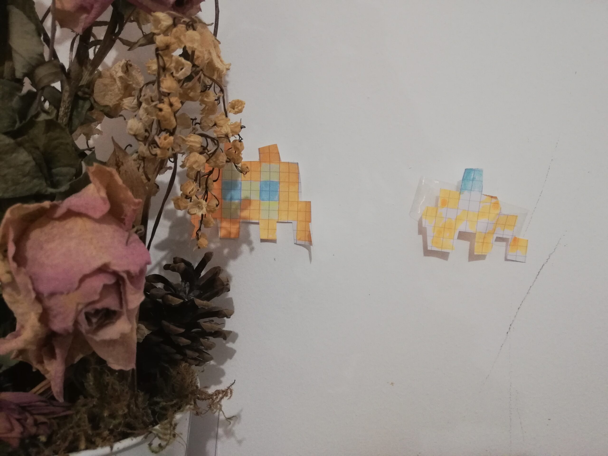 J’ai  aussi fait des invadersen papier et j’en ai fait une chasse au trésor. Je les ai cachés dans toute la maison.