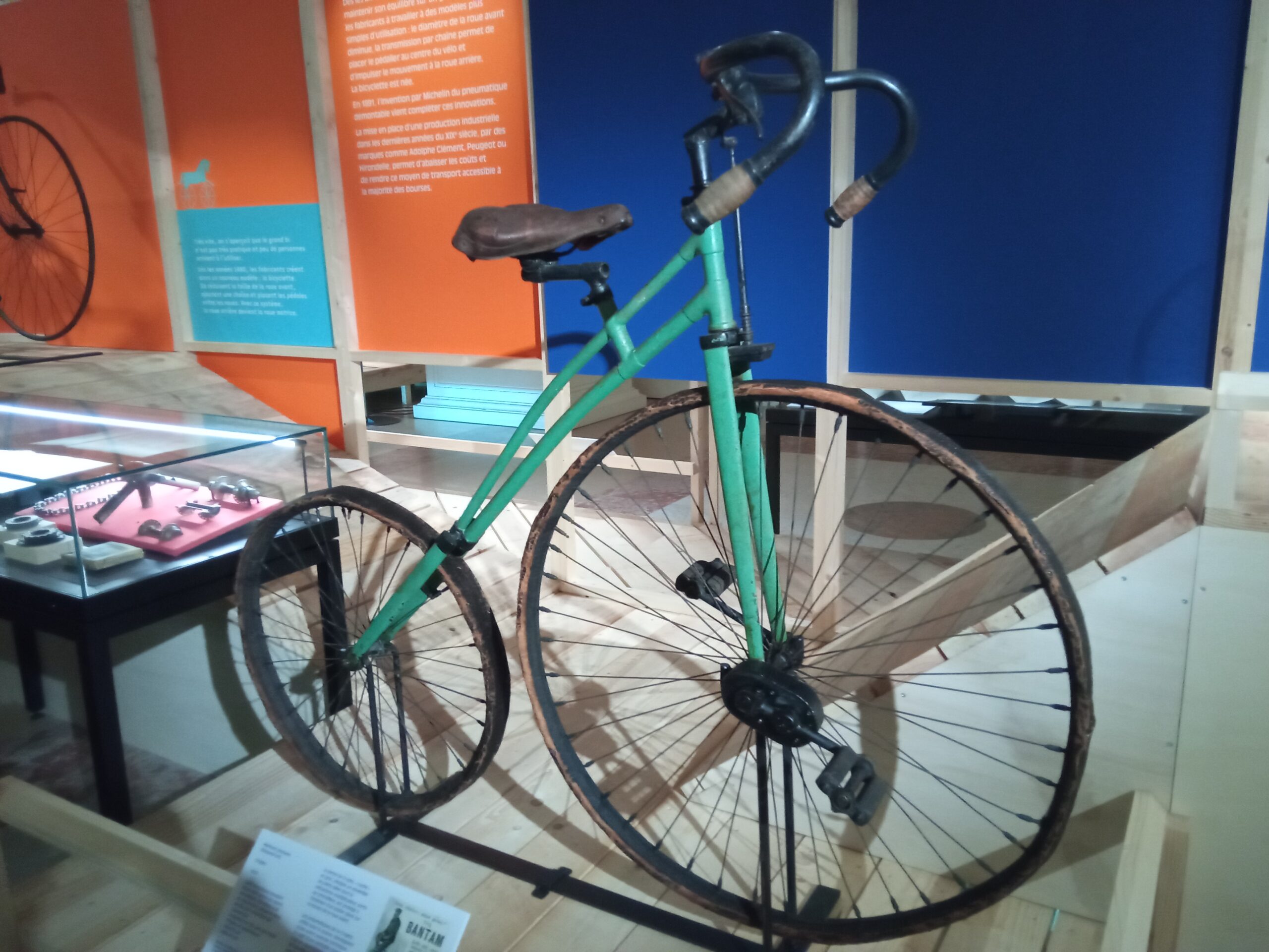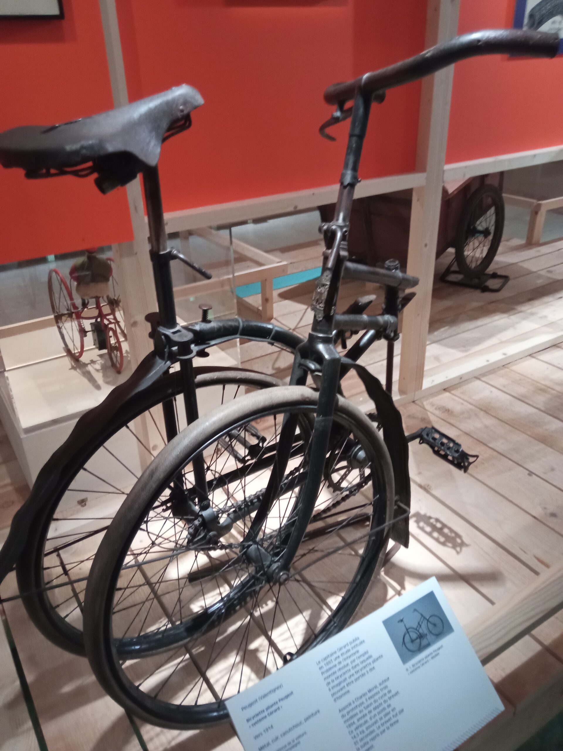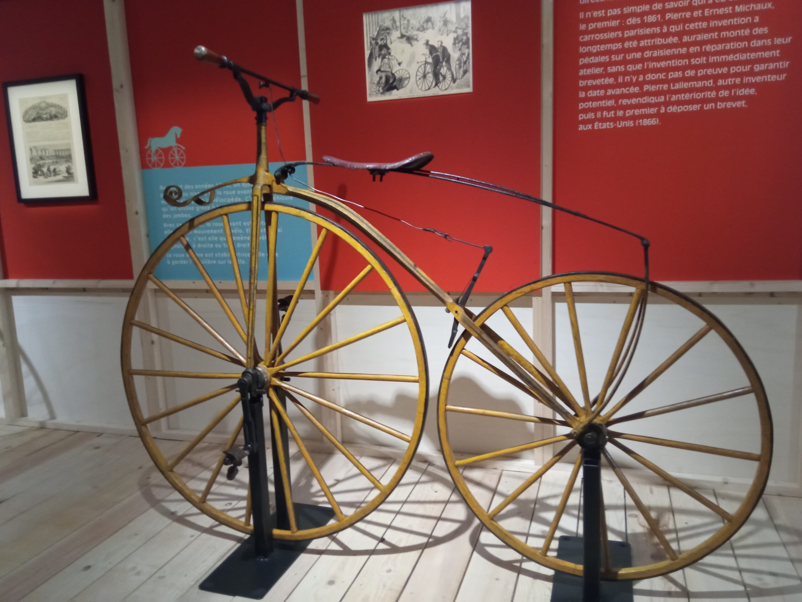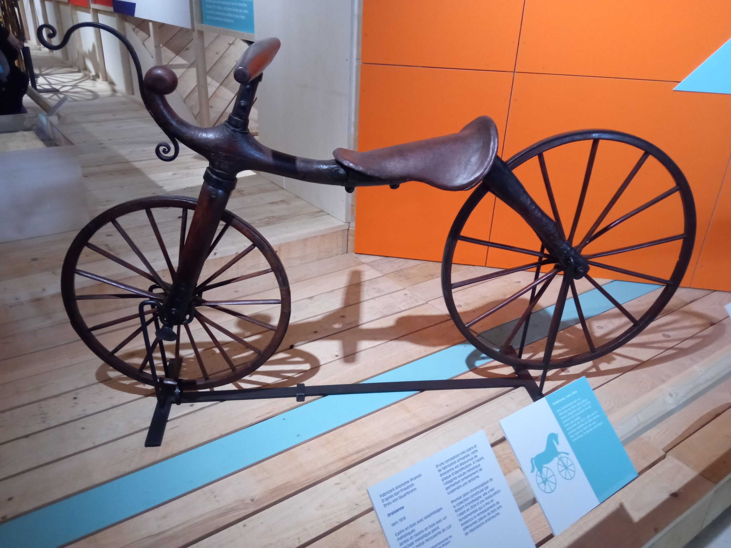 Au début le vélo était plus une draisienne. La première était constituée tout en bois sauf l’equivalent du pneu qui était un anneau de fer et la selle qui etait en cuir.