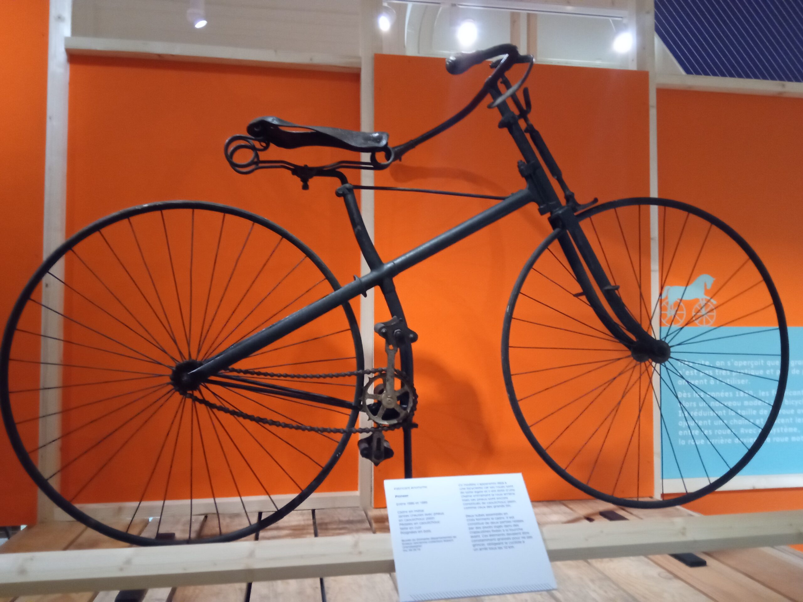 Ceci est le premier vélo qui a une chaîne et une selle pour amortir. Les roues ont quasi la même taille et n’ont plus besoin d’etre immense pour avancer vite.